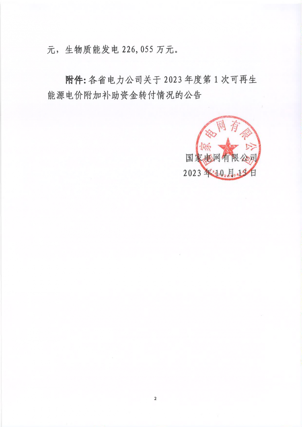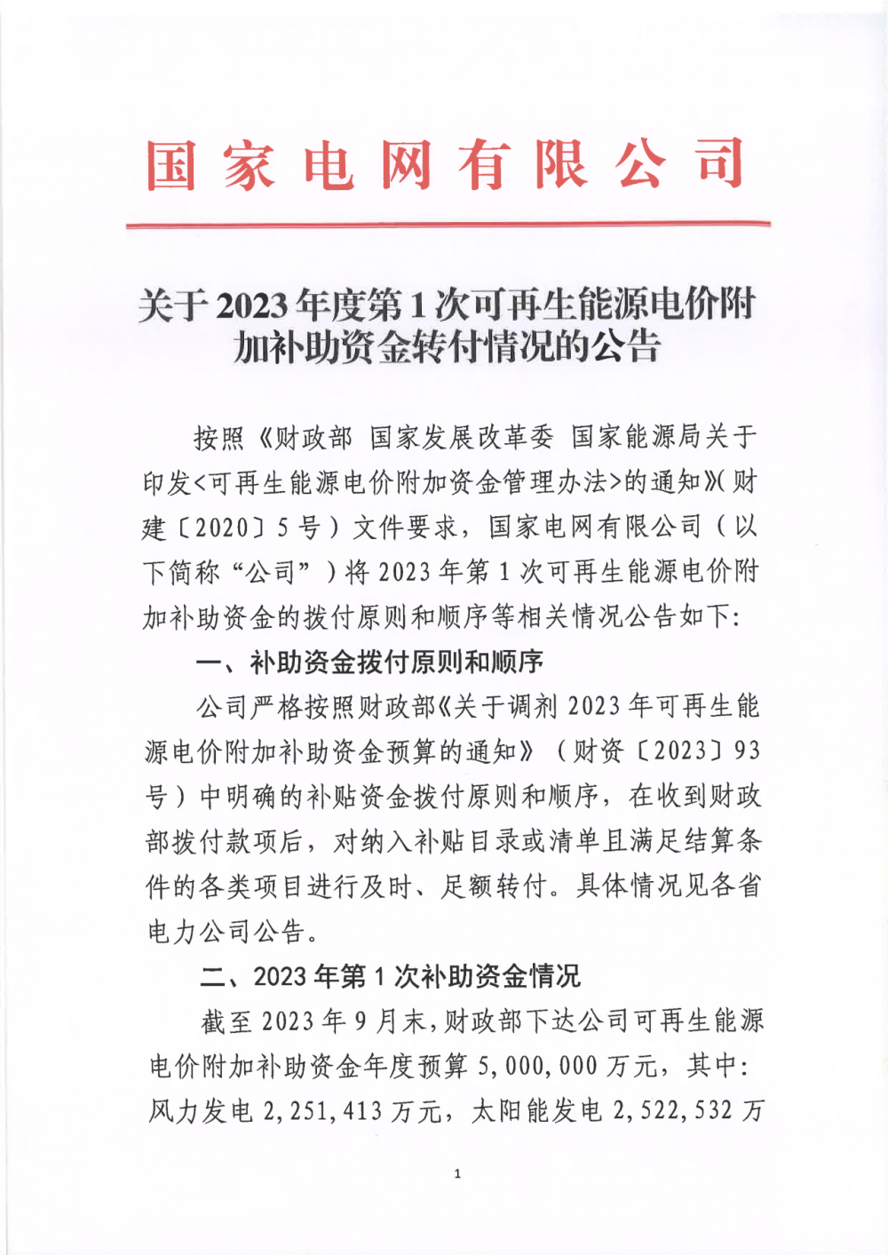 10月19日,国网新能源云平台发布《关于2023年度第1次可再生能源电价附加补助资金转付情况的公告》(以下简称《公告》)。按照《财政部 国家发展改革委 国家能源局关于印发<可再生能源电价附加资金管理办法的通知》(财建〔2020〕5号)文件要求,国家电网有限公司将2023年第1次可再生能源电价附加补助资金的拨付原则和顺序等相关情况进行公告。