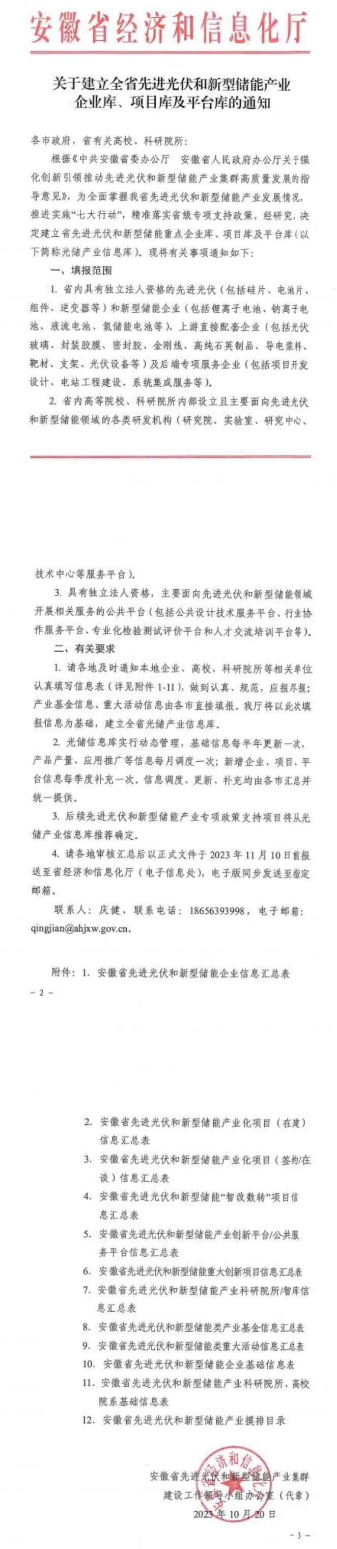 日前,安徽省经济和信息化厅发布《安徽省经济和信息化厅关于建立全省先进光伏和新型储能产业企业、项目及平台库的通知》。