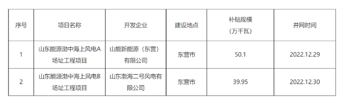 为落实《山东省人民政府关于印发2022“稳中求进”高质量发展政策清单(第二批)的通知》(鲁政发〔2022〕4号)要求,我局结合《山东省海上风电财政补贴实施细则》有关规定,组织专家组对东营市上报的2022年度建成并网海上风电项目财政补贴申请材料进行了复审。经复审,东营市上报的两个海上风电项目补贴申请材料符合要求,现将项目基本信息及补贴规模公示如下: