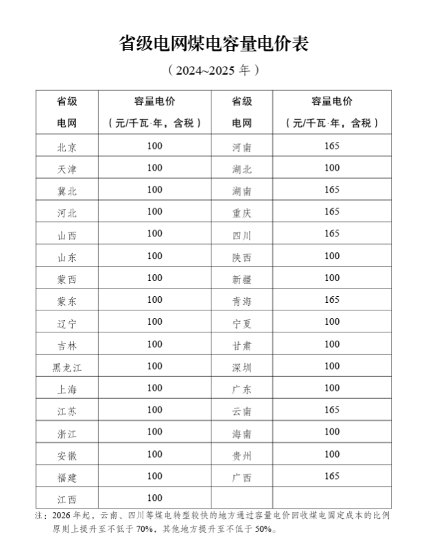 (二)容量电价水平的确定。煤电容量电价按照回收煤电机组一定比例固定成本的方式确定。其中,用于计算容量电价的煤电机组固定成本实行全国统一标准,为每年每千瓦330元;通过容量电价回收的固定成本比例,综合考虑各地电力系统需要、煤电功能转型情况等因素确定,2024~2025年多数地方为30%左右,部分煤电功能转型较快的地方适当高一些,为50%左右(各省级电网煤电容量电价水平具体见附件)。2026年起,将各地通过容量电价回收固定成本的比例提升至不低于50%。
