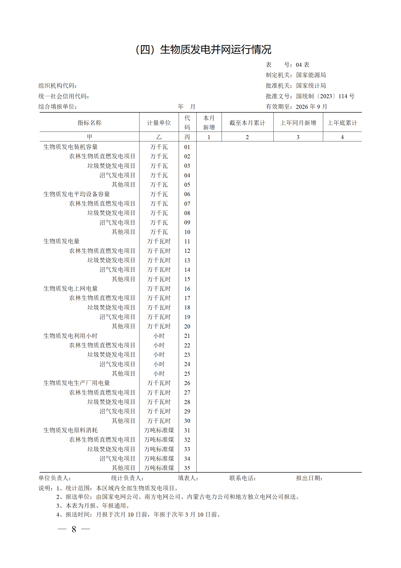 根据有关规定和工作需要,恒盛娱乐对可再生能源发电利用统计报表制度进行了修订,形成了《可再生能源利用统计调查制度》(以下简称《统计调查制度》),已经国家统计局批准(国统制〔2023〕114号),现印发执行。请各单位认真组织实施,严格按照《统计调查制度》的要求,真实、准确、完整地做好各项统计数据报送工作。