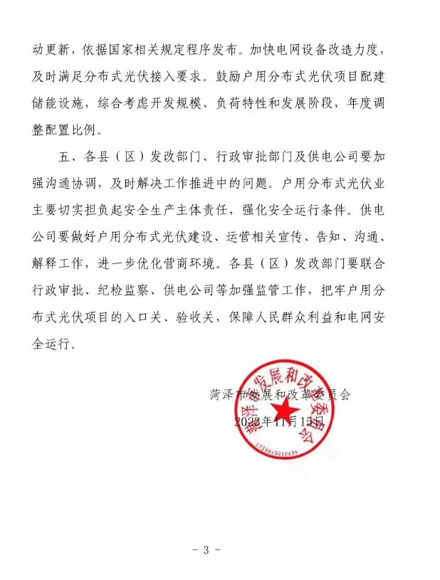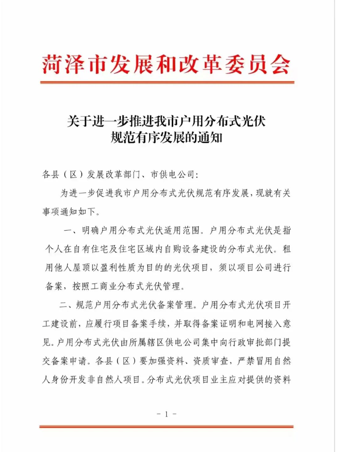 11月15日山东菏泽市发展和改革委员会下《发关于进一步推进我市户用分布式光伏规范有序发展的通知》。
