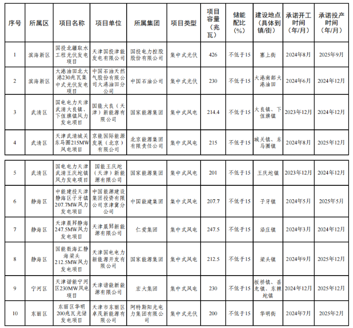 近日,天津市发改委公示拟纳入天津市2023年风电、光伏发电项目开发建设方案的项目清单,共包含3个集中式光伏项目、7个集中式风电项目,总装机规模2384.1MW,其中光伏856MW、风电1528.1MW。