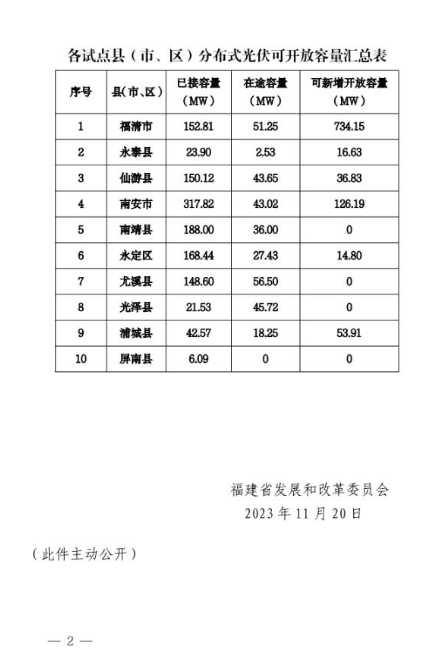 11月20日,福建省发改委发布《关于发布试点县分布式光伏接入电网承载力信息的通告》。文件指出,截至2023年第三季度末,福清市、永泰县、仙游县、南安市、南靖县、永定区、尤溪县、光泽县、浦城县和屏南县10个县(市、区)分布式光伏接入电网承载力评估结果为:已接入总容量1219.88MW,在途总容量324.35MW,可新增开放总容量982.51MW。