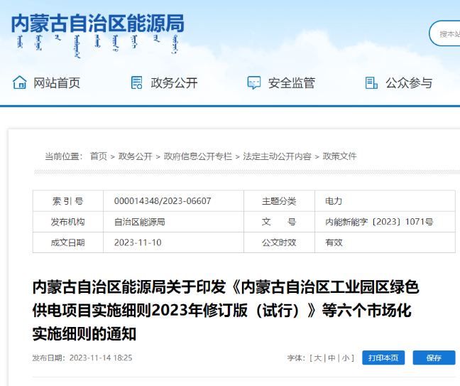 内蒙古自治区能源局关于印发《内蒙古自治区工业园区绿色供电项目实施细则2023年修订版(试行)》等六个市场化实施细则的通知