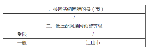 日前,浙江省能源局发布《关于发布分布式光伏接入电网承载力情况的公告》。根据《国家能源局综合司关于印发开展分布式光伏接入电网承载力及提升措施评估试点工作的通知》(国能综通新能〔2023〕74号),浙江省选取杭州萧山区,宁波宁海县、前湾新区,湖州德清县、长兴县,嘉兴海宁市,绍兴柯桥区,金华武义县,衢州江山市9个试点县(市)开展评估工作。根据评估结果,仅衢州江山市低压配网接网预警等级为一般。