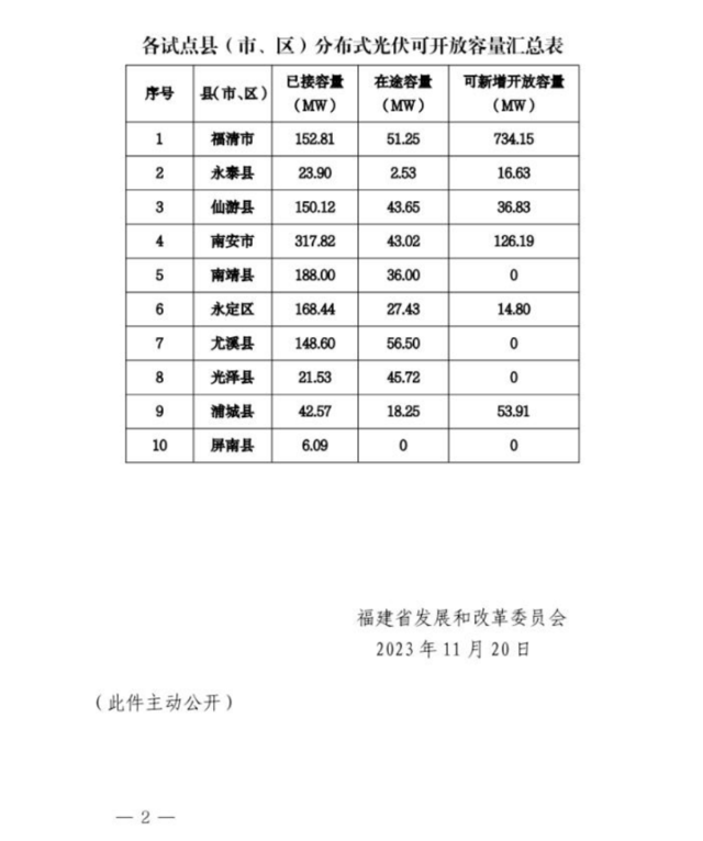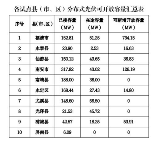 11月20日,福建省发展和改革委员会发布《关于发布试点县分布式光伏接入电网承载力信息的通告》(下称《通告》)。