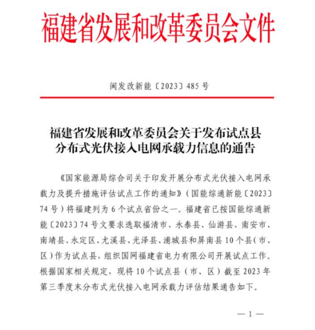 《通告》称,《国家能源局综合司关于印发开展分布式光伏接入电网承载力及提升措施评估试点工作的通知》(国能综通新能〔2023〕74号)将福建列为6个试点省份之一。按照国能综通新能〔2023〕74号文要求,福建省选取福清市、永泰县、仙游县、南安市、南靖县、永定区、尤溪县、光泽县、浦城县和屏南县10个县(市、区)作为试点县,组织国网福建省电力有限公司开展试点工作。