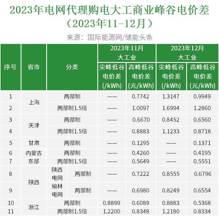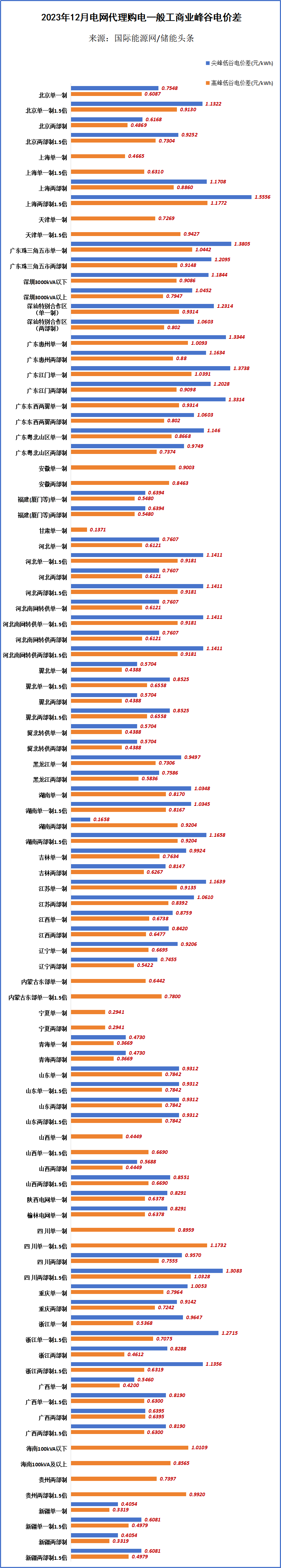 据了解,12月电网代理购电价格中,全国峰谷价最高的是上海市,执行大工商业两部制1.5倍尖峰电价时,峰谷价差为1.6994元/kWh。