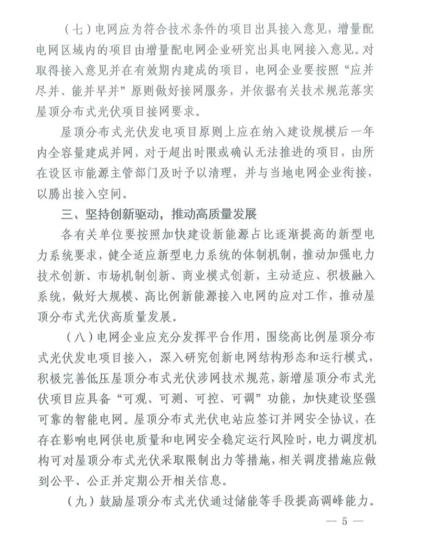 新增屋顶分布式光伏项目应具备“可观、可测、可控、可调”功能,加快建设坚强可靠的智能电网。屋顶分布式光伏电站应签订并网安全协议,在存在影响电网供电质量和电网安全稳定运行风险时,电力调度机构可对屋顶分布式光伏采取限制出力等措施。