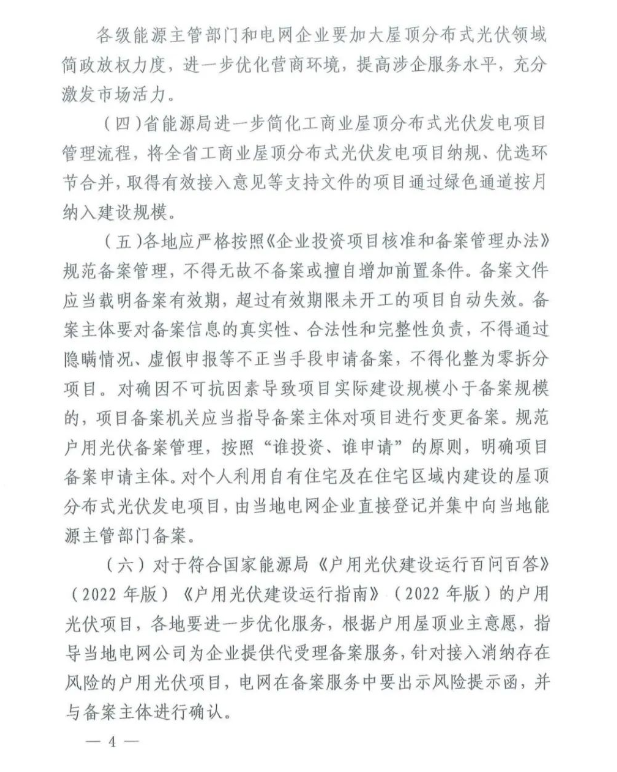 对于户用光伏,针对接入消纳存在风险的户用光伏项目,电网在备案服务中要出示风险提示函,并与备案主体进行确认。不得化整为零拆分项目,户用光伏备案管理,按照“谁投资、谁申请”的原则,明确项目备案申请主体。