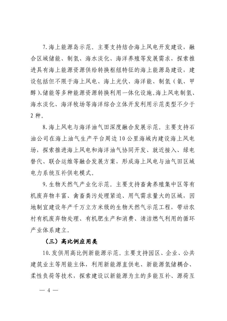 海上风电与海洋油气田深度融合发展示范。主要支持石油公司在海上油气生产平台周边10公里海域内建设海上风电场,探索推进海上风电和海洋油气协同开发、就近接入、绿电替代、联合运维等融合发展方案,形成海上风电与油气田区域电力系统互补供电模式。
