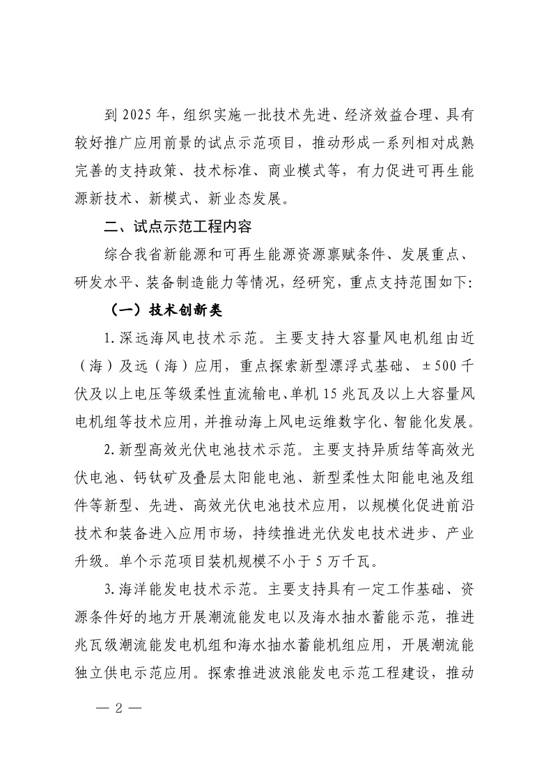 其中技术创新类包括,支持深远海风电技术示范。主要支持大容量风电机组由近(海)及远(海)应用,重点探索新型漂浮式基础、±500千伏及以上电压等级柔性直流输电、单机15兆瓦及以上大容量风电机组等技术应用,并推动海上风电运维数字化、智能化发展。