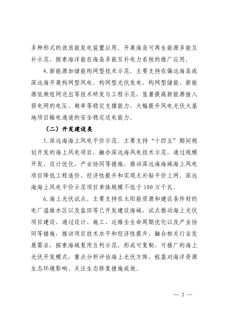 开发建设类包括,支持深远海海上风电平价示范。主要支持“十四五”期间规划开发的海上风电项目,融合深远海风电技术示范,通过规模开发、设计优化、产业协同等措施,推动深远海海域海上风电项目降低工程造价、经济性提升和实现无补贴平价上网。深远海海上风电平价示范项目单体规模不低于100万千瓦。