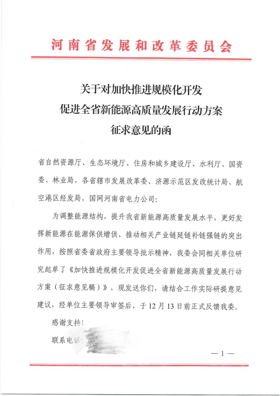 12月7日,河南省发改委印发《关于对加快推进规模化开发促进全省新能源高质量发展行动方案征求意见的函》,文件指出,要强化风电和集中式光伏、公共建筑屋顶光伏、地热能等领域规模化开发力度,整体谋划,分批实施,加快全省能源结构绿色低碳转型。