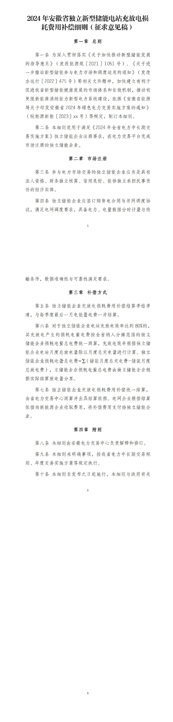 附件:2024年安徽省独立新型储能电站充放电损耗费用补偿细则(征求意见稿)