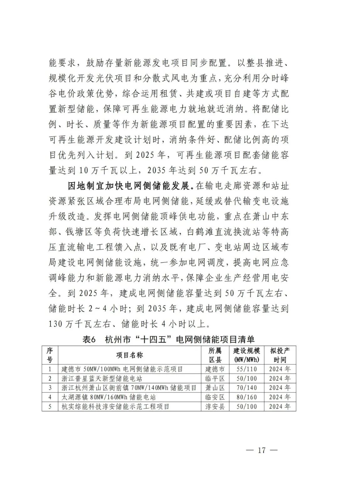 因地制宜加快电网侧储能发展。在输电走廊资源和站址资源紧张区域合理布局电网侧储能,延缓或替代输变电设施升级改造。发挥电网侧储能顶峰供电功能,重点在萧山中东部、钱塘区等负荷快速增长区域,白鹤滩直流换流站等特高压直流输电工程馈入点,以及既有电厂、变电站周边区域布局建设电网侧储能设施,统一参加电网调度,提高电网应急调峰能力和新能源电力消纳水平,保障企业生产经营用电安?全。到2025年,建成电网侧储能容量达到50万千瓦左右、储能时长2~4小时;到2035年,建成电网侧储能容量达到130万千瓦左右、储能时长4小时以上。