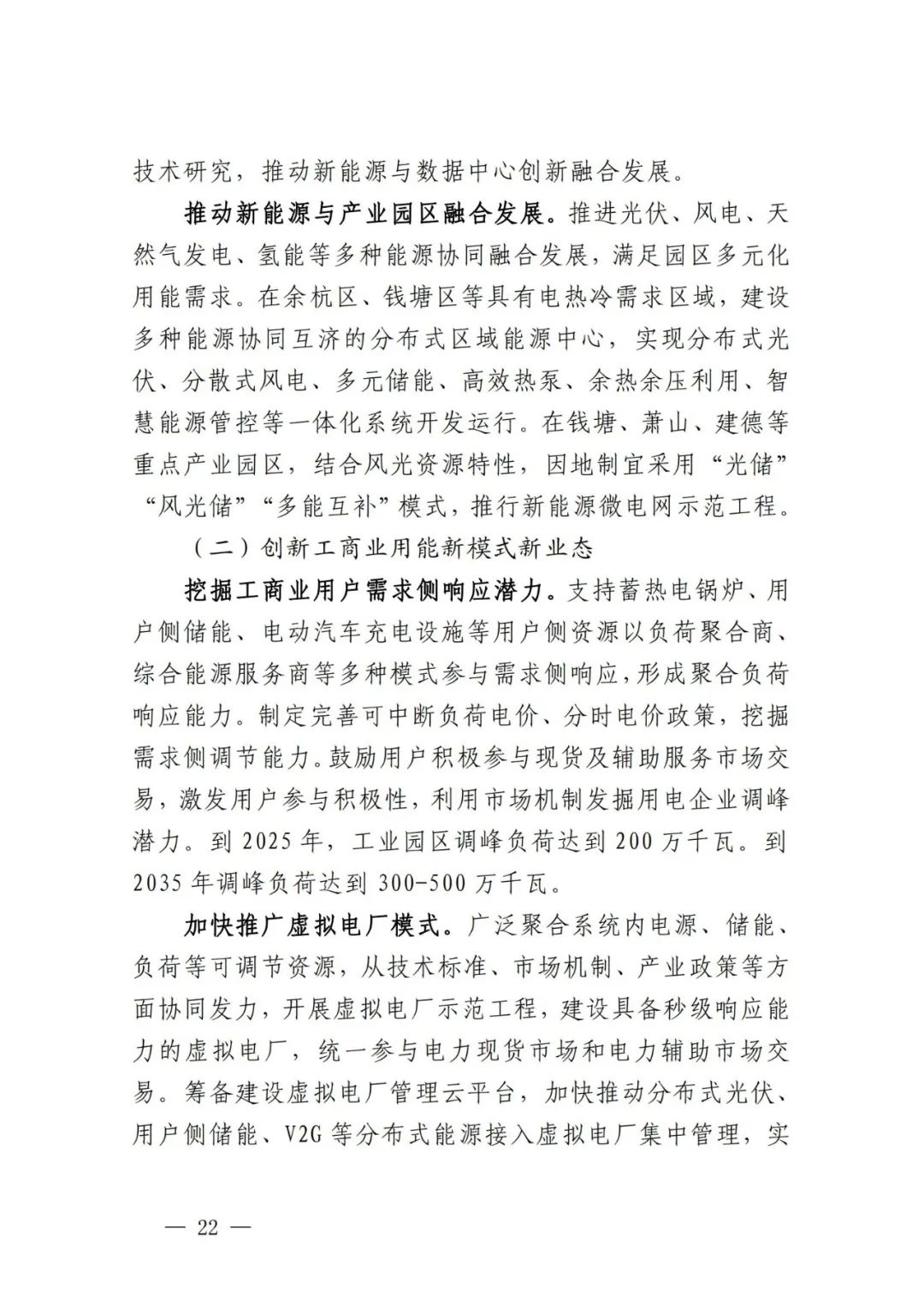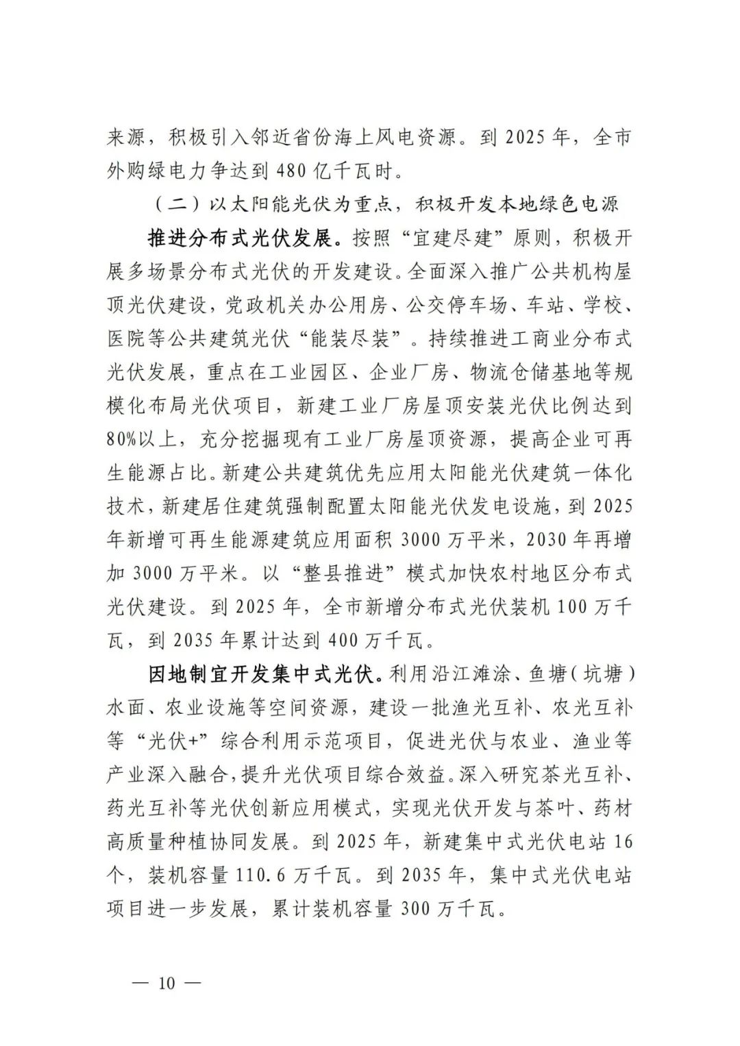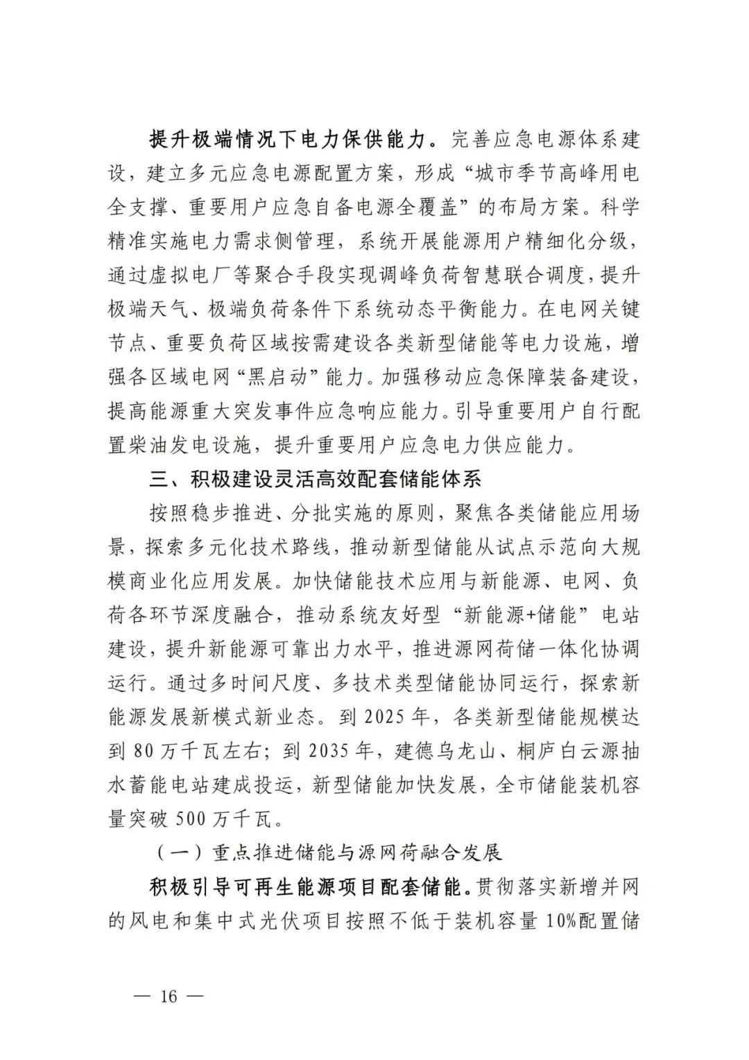 积极引导可再生能源项目配套储能。贯彻落实新增并网的风电和集中式光伏项目按照不低于装机容量10%配置储能要求,鼓励存量新能源发电项目同步配置。以整县推进、规模化开发光伏项目和分散式风电为重点,充分利用分时峰谷电价政策优势,综合运用租赁、共建或项目自建等方式配置新型储能,保障可再生能源电力就地就近消纳。将配储比例、时长、质量等作为新能源项目配置的重要因素,在下达可再生能源开发建设计划时,消纳条件好、配储比例高的项目优先列入计划。到2025年,可再生能源项目配套储能容量达到10万千瓦以上,2035年达到50万千瓦左右。