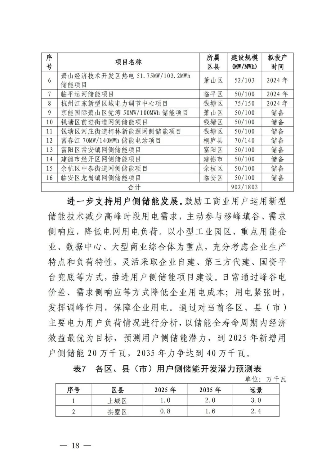 进一步支持用户侧储能发展。鼓励工商业用户运用新型储能技术减少高峰时段用电需求,主动参与移峰填谷、需求侧响应,降低电网用电负荷。以小型工业园区、重点用能企业、数据中心、大型商业综合体为重点,充分考虑企业生产特点和负荷特性,灵活采取企业自建、第三方代建、国资平台兜底等方式,推进用户侧储能项目建设。日常通过峰谷电价差、需求侧响应等方式降低企业用电成本;用电紧张时,发挥调峰作用,保障企业用电。通过对当前各区、县(市)主要电力用户负荷情况进行分析,以储能全寿命周期内经济效益最优为目标,预测用户侧储能潜力,到2025年新增用户侧储能20万千瓦,2035年力争达到40万千瓦。