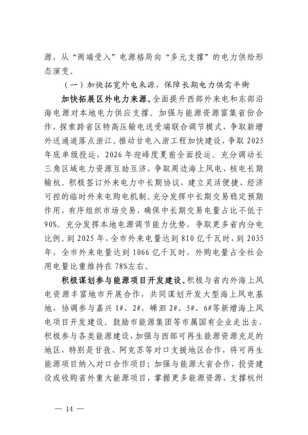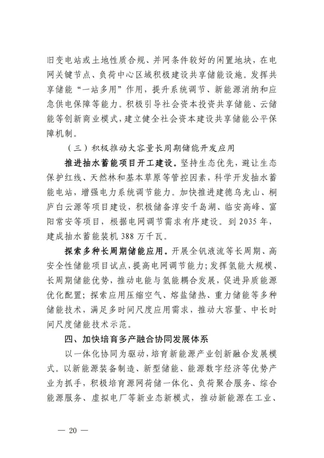 推进抽水蓄能项目开工建设。坚持生态优先,避让生态保护红线、天然林和基本草原等管控因素,科学开发抽水蓄能电站,增强电力系统调节能力。加快推进建德乌龙山、桐庐白云源等项目建设,积极储备淳安千岛湖、临安高峰、富阳常安等项目,根据电网调节需求有序建设。到2035年,建成抽水蓄能装机388万千瓦。