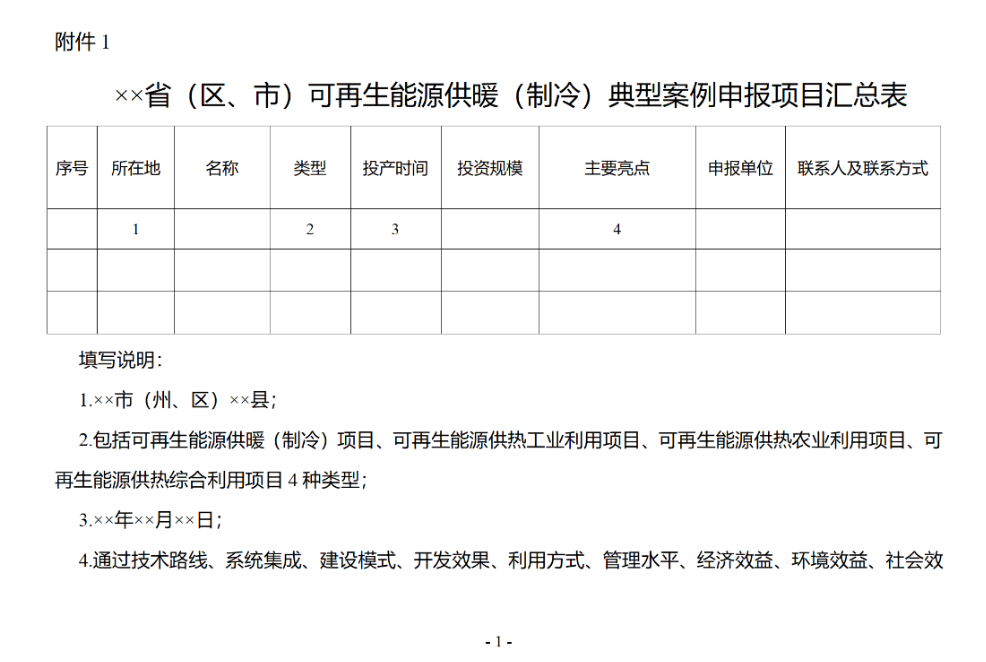 1.××省(区、市)可再生能源供暖(制冷)典型案例申报项目汇总表