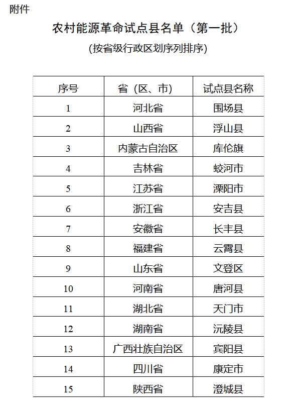 文件指出,经地方申报、专家评估和部门审核,确定了第一批15个符合条件的农村能源革命试点县。