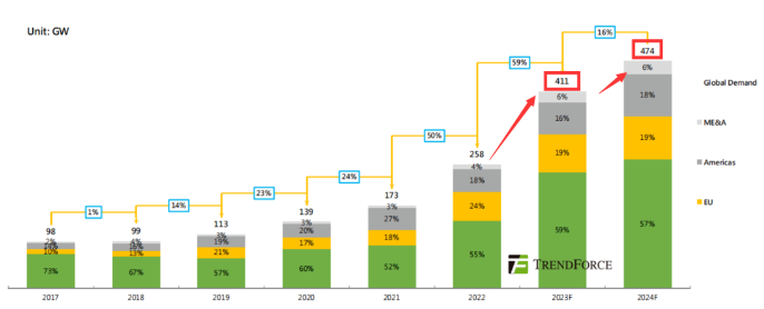 2023年12月13日,集邦咨询发布展望报告预测,2023年全球光伏新增装机411GW,同比增长59%;预计2024年新增装机474GW,同比增长16%,新增装机增速放缓,将从?速增?回归理性。