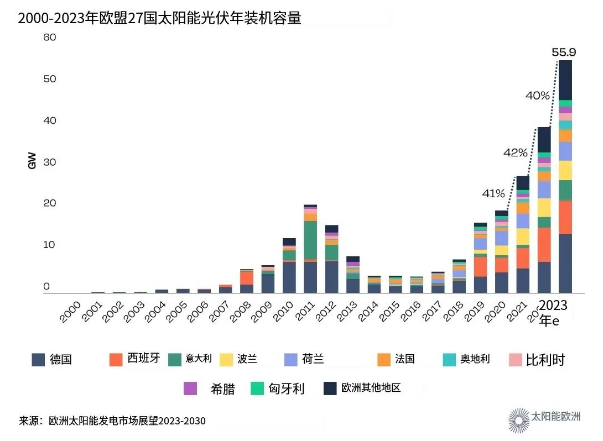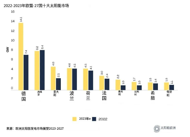 2023年,德国重新回到欧洲太阳能排名第一的位置,2023年装机容量为14.1 GW。之后是西班牙(8.2GW)、意大利(4.8GW)、波兰(4.6GW )和荷兰(4.1 GW)。