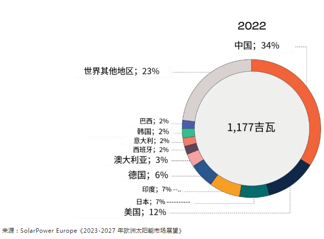 2022年,这些经济体的年度新增光伏装机分别为:欧洲40GW、美国19GW、印度18GW、巴西10GW、沙特2GW、南非1GW、澳大利亚3.7GW、阿联酋0.3GW。