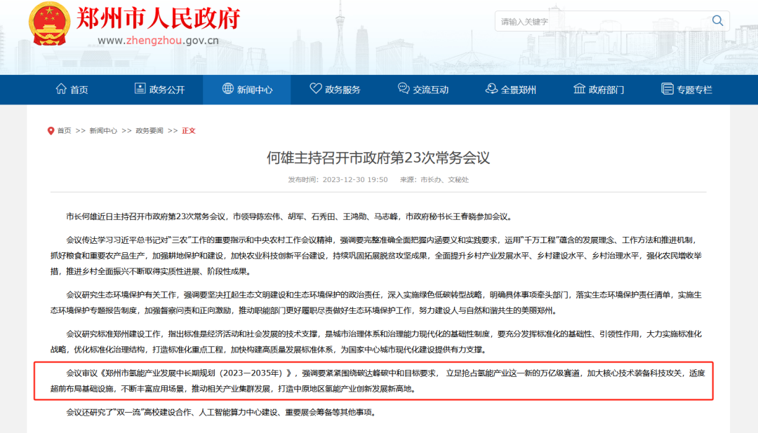 会议审议《郑州市氢能产业发展中长期规划(2023—2035年)》,强调要紧紧围绕碳达峰碳中和目标要求, 立足抢占氢能产业这一新的万亿级赛道,加大核心技术装备科技攻关,适度超前布局基础设施,不断丰富应用场景,推动相关产业集群发展,打造中原地区氢能产业创新发展新高地。