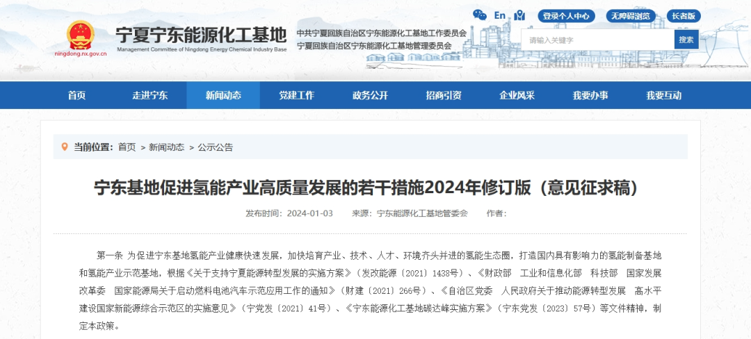1月3日,宁东能源化工基地管委会发布宁东基地促进氢能产业高质量发展的若干措施2024年修订版(送审稿),其中指出,鼓励、支持企业向绿氢生产和应用方向转型升级,在建设时序上,应确保制氢和应用端先开工,新能源部分不得早于制氢负荷及应用设施投产;制氢及应用分期投产的,配套新能源应按对应规模分期建设。鼓励、支持化工企业使用绿氢逐步替代煤制氢和甲醇制氢。对在宁东基地实施绿氢替代的化工项目,经认定,本级财政按5.6元/公斤标准给予用氢补贴,单个企业每年不超过500万元,最多补贴3年。企业新增绿氢生产设备投资1000万元(含)—2000万元(不含)的,按设备投资额6%给予一次性补助;投资2000万元(含)以上的,按设备投资额7%给予一次性补助,最高不超过300万元。