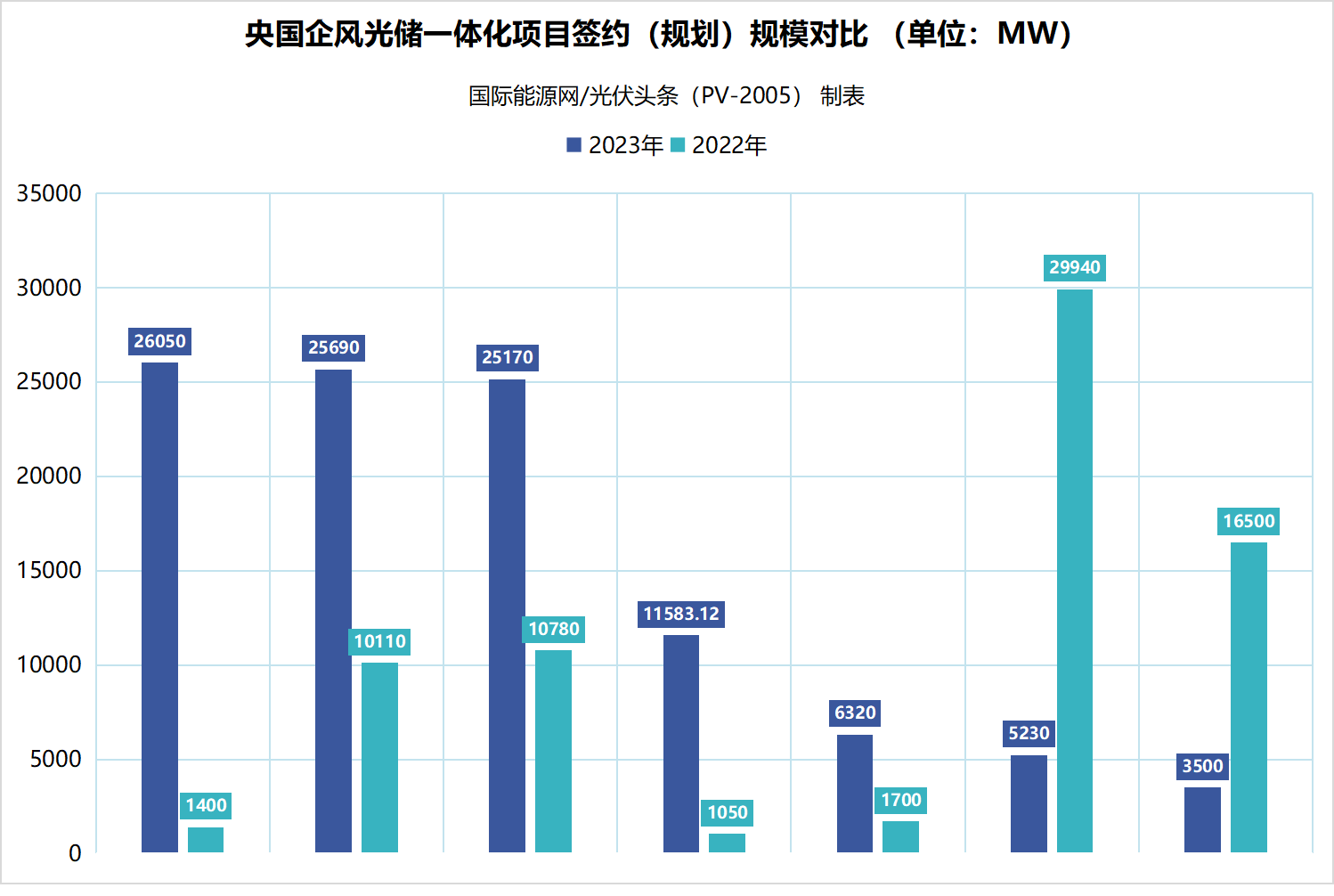 注:因2023年全年和2023年全年两个时间段内,中国华电、中国华电、国家能源集团、国家电投、粤水电、大唐集团、中国能建、京能集团7家央国企均有风光储一体化项目签约规模,数据完整,故选取这7家企业数据进行参考展示。
