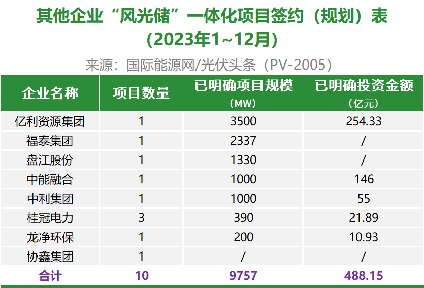 此外,除央国企的其他企业签约风光储一体化项目10个,明确项目规划规模9.757GW,投资总额488.15亿元。