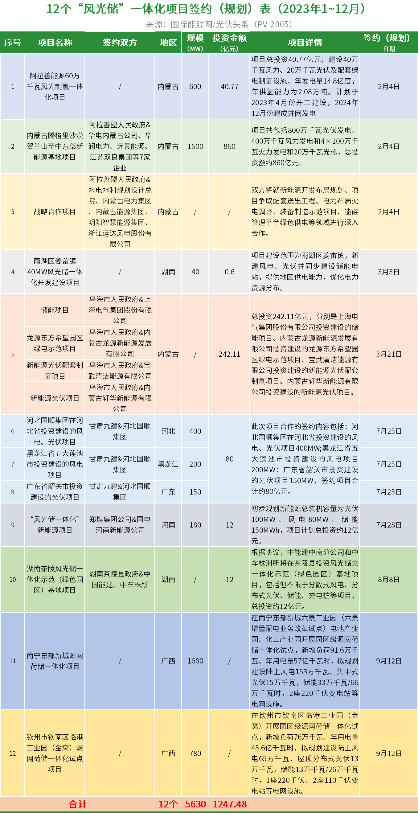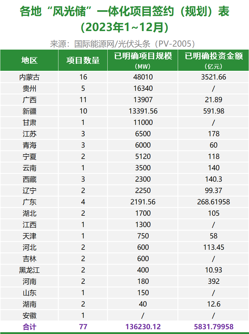 国际能源网/光伏头条(PV-2005)根据公开资料整理,2023年1-12月,全国共签约/规划风光储一体化项目77个,已明确的项目规模为136.23GW,已明确投资金额为5831.80亿元。