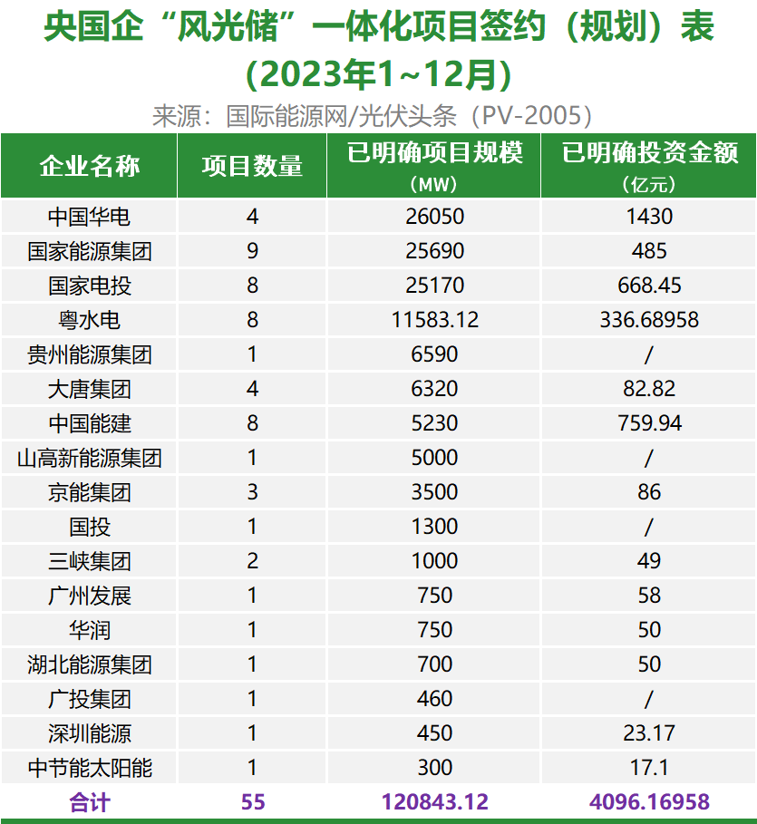 初步统计,中国华电、国家能源集团、国家电投、粤水电、贵州能源集团、大唐集团、中国能建、山高新能源集团、京能集团、国投、三峡集团、广州发展、华润、湖北能源集团、广投集团、深圳能源、中节能太阳能17家央国企签约/规划风光储一体化项目55个,项目规划规模120.84GW,投资总额4096.17亿元。