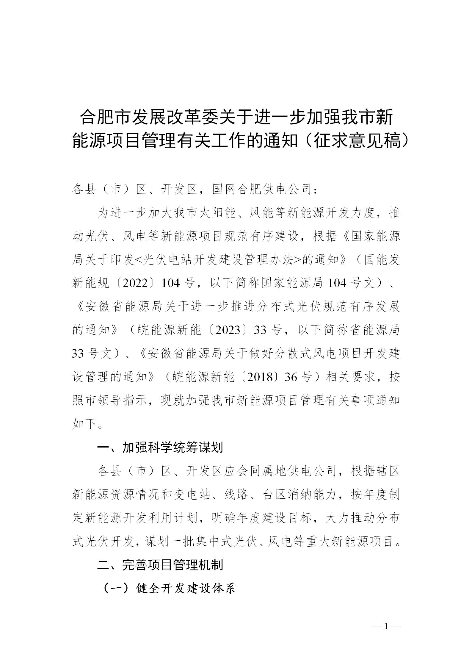 附件1:合肥市发展改革委关于进一步加强我市新能源项目管理有关工作的通知(征求意见稿)