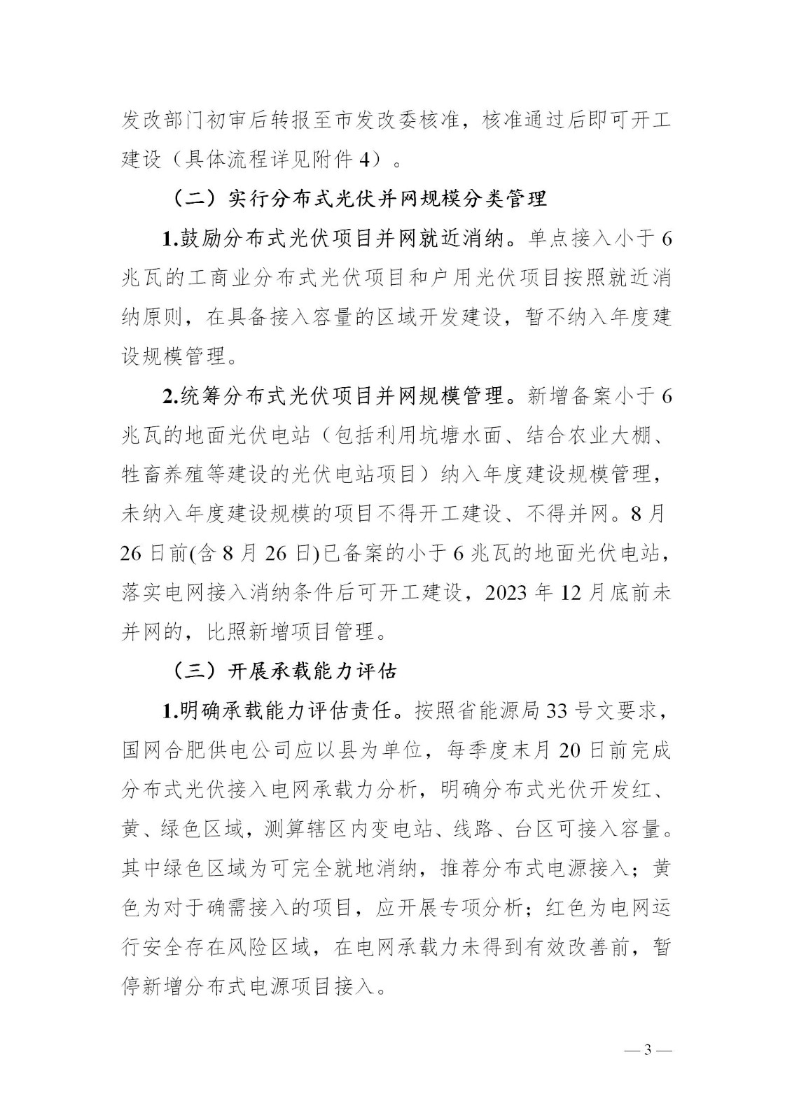 统筹分布式光伏项目并网规模管理。新增备案小于6兆瓦的地面光伏电站(包括利用坑塘水面、结合农业大棚、牲畜养殖等建设的光伏电站项目)纳入年度建设规模管理,未纳入年度建设规模的项目不得开工建设、不得并网。8月26日前(含8月26日)已备案的小于6兆瓦的地面光伏电站,落实电网接入消纳条件后可开工建设,2023年12月底前未并网的,比照新增项目管理。