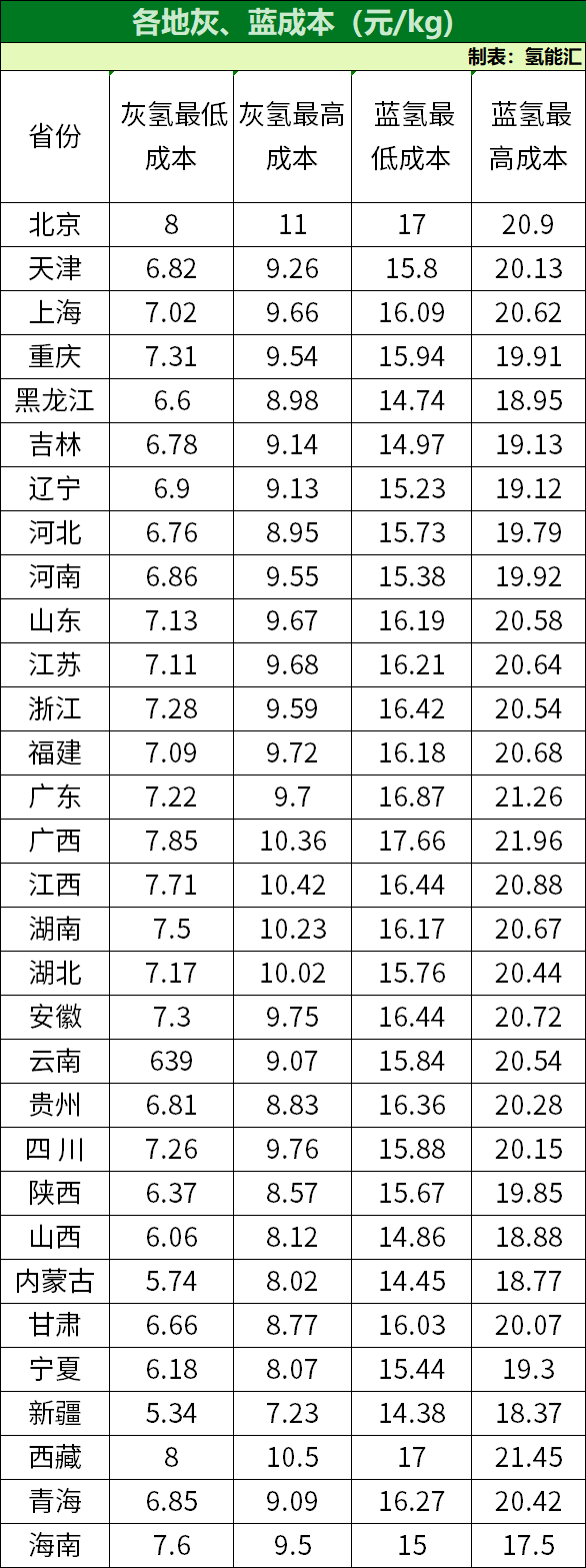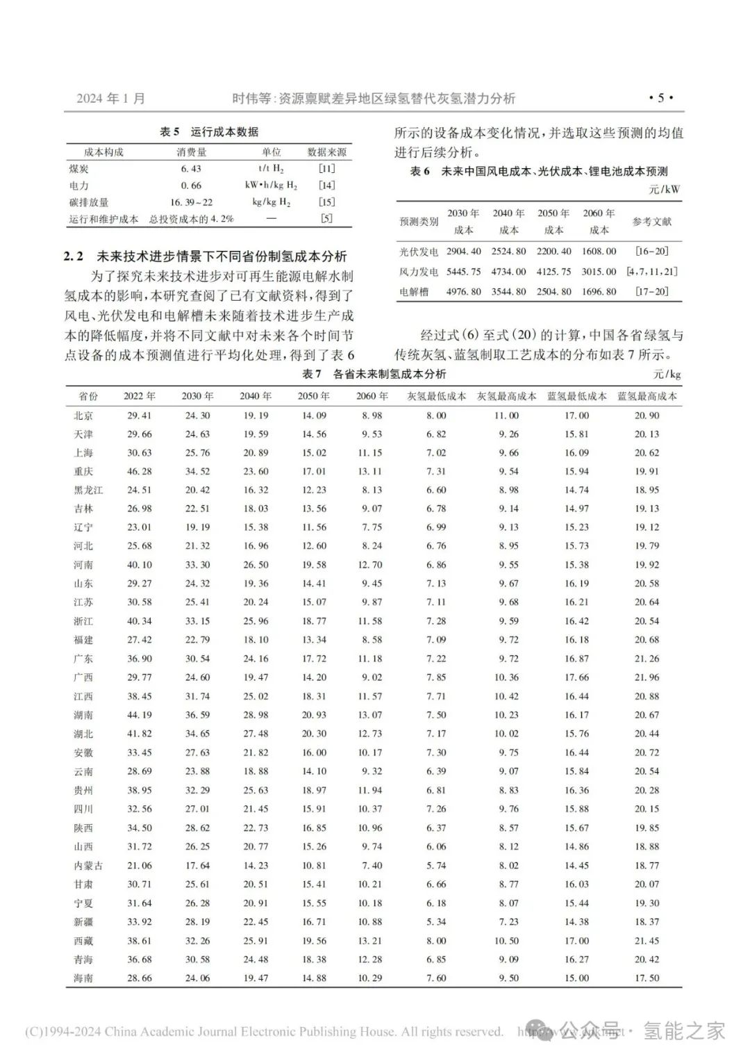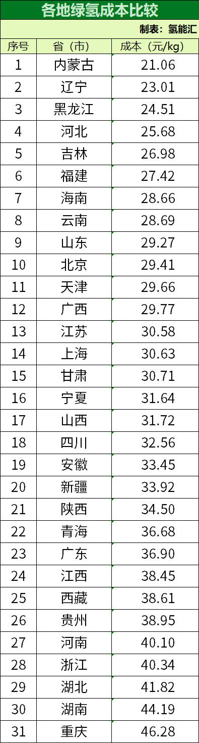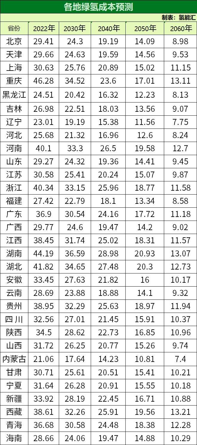 2024年第一期《现代化工》发表了《资源禀赋差异地区绿氢替代灰氢潜力分析》一文,对目前及未来各地不同地区绿氢成本进行了测算。从比较来看,目前北方制氢成本低于南方,尤其是内蒙、辽宁、黑龙江、河北、吉林五地制氢成本最低,而河南、浙江湖北、湖南、重庆则是成本最高。内蒙以21.06元/kg居成本最低,重庆则比其2倍还要高,达到46.28元/kg。