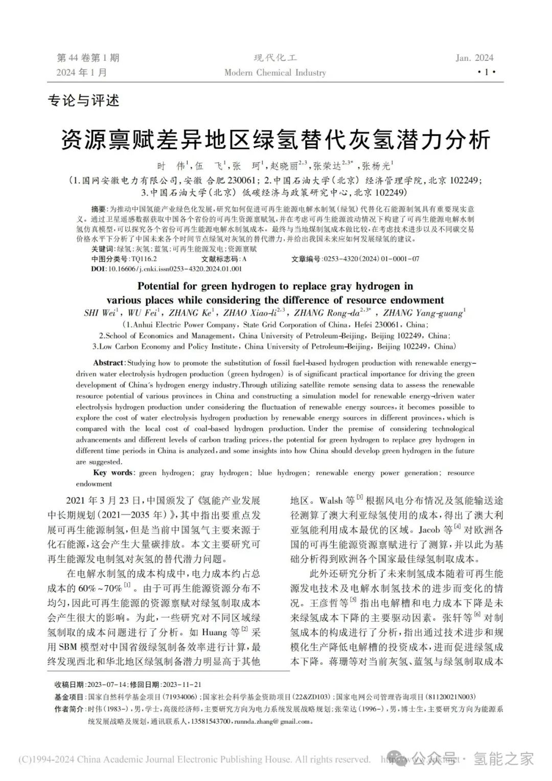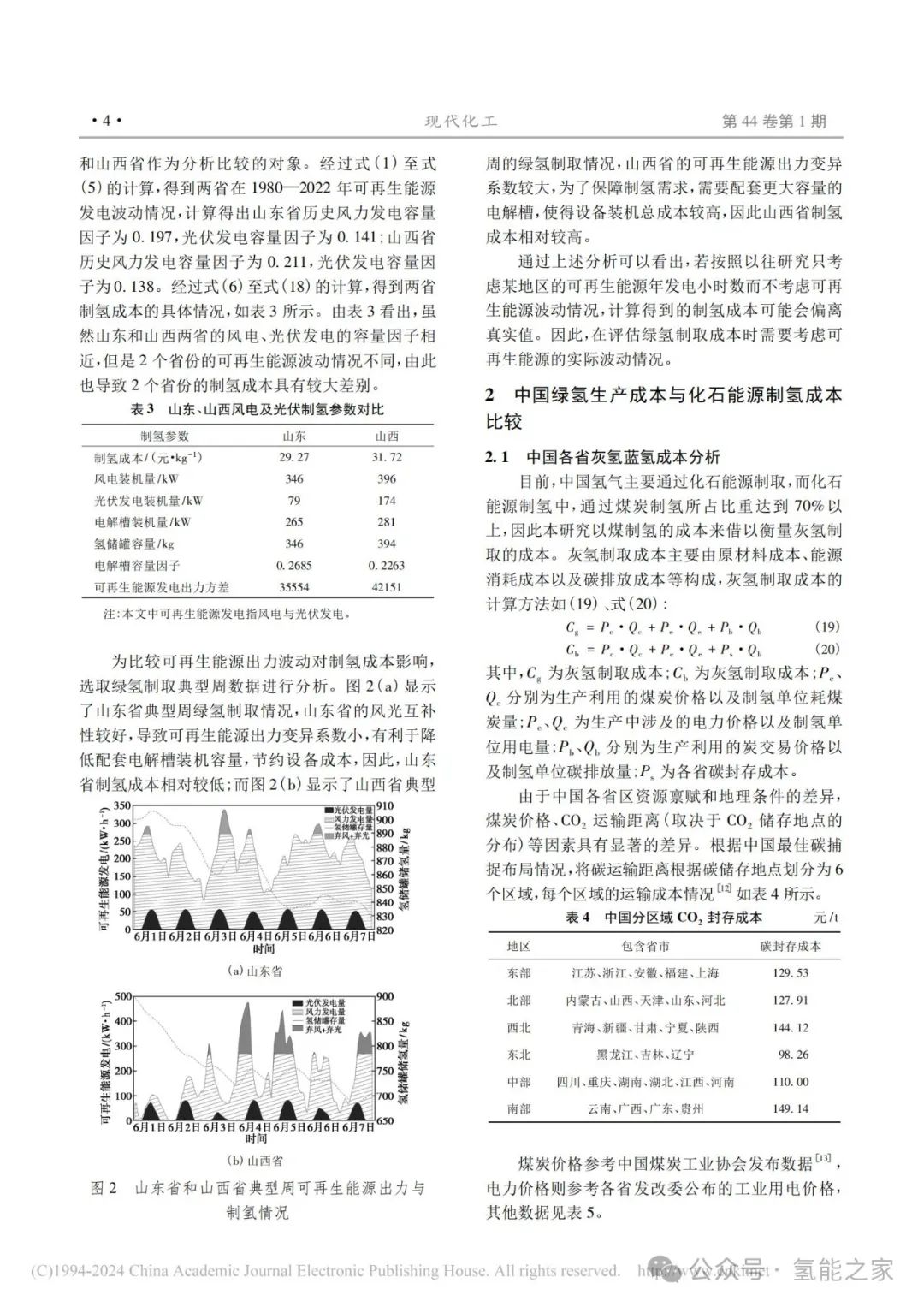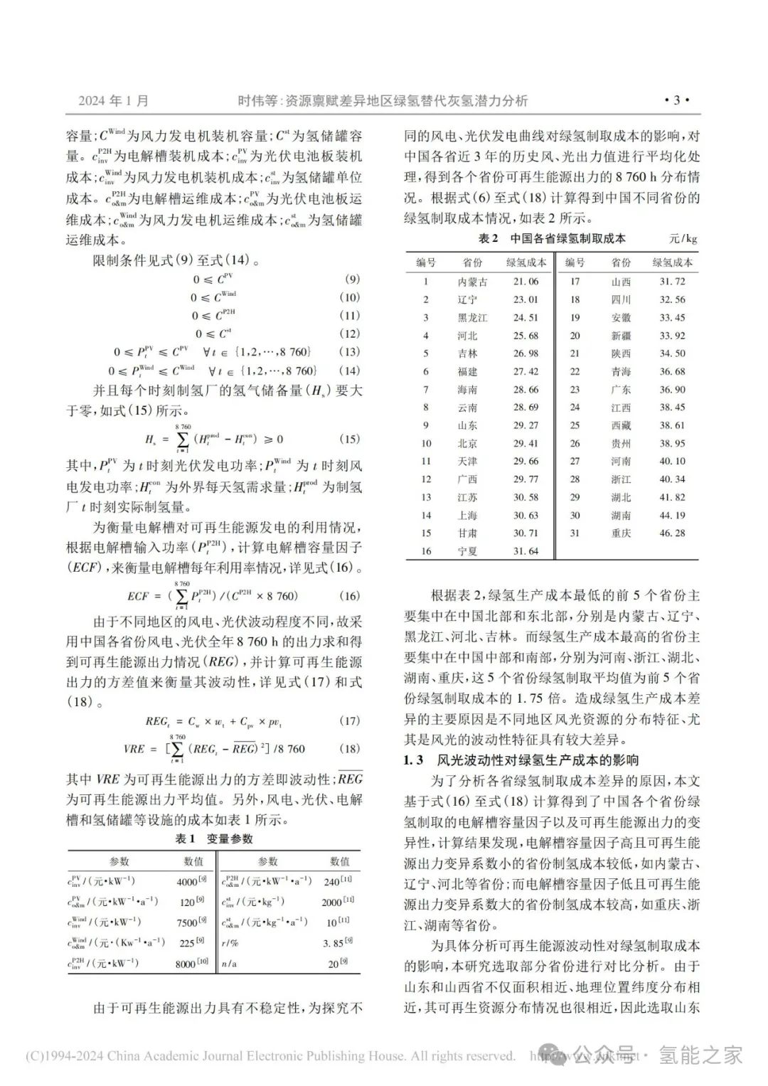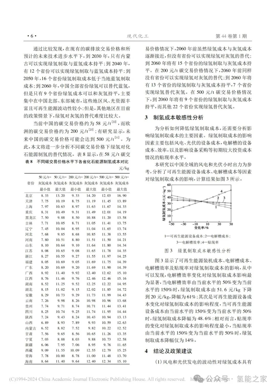 2024年第一期《现代化工》发表了《资源禀赋差异地区绿氢替代灰氢潜力分析》一文,对目前及未来各地不同地区绿氢成本进行了测算。从比较来看,目前北方制氢成本低于南方,尤其是内蒙、辽宁、黑龙江、河北、吉林五地制氢成本最低,而河南、浙江湖北、湖南、重庆则是成本最高。内蒙以21.06元/kg居成本最低,重庆则比其2倍还要高,达到46.28元/kg。