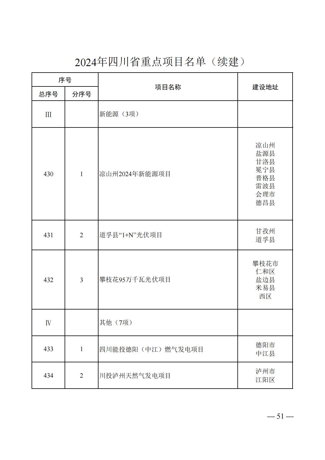 2024年四川省重点项目名单中续建项目共504项,新开工项目共计196项。其中,涉及1个风电项目,7个光伏项目。