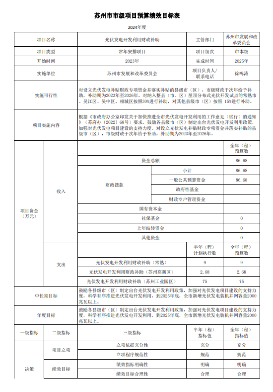 苏州市发改委发布苏州市发展和改革委员会2024年度项目预算绩效目标表,其中包括《光伏发电开发利用财政补助项目预算绩效目标表》。根据《目标表》显示,对设立光伏发电补贴财政专项资金并落实补贴的县级市(区),市级财政于次年给予补助,补助期为2023年至2026年。对纳入整县(市、区)屋顶分布式光伏开发试点的常熟市、吴江区、吴中区、相城区按照30%进行补助,对其他县级市(区)按照15%进行补助。