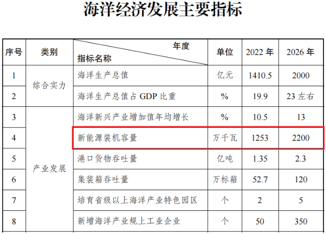《通知》指出,海洋经济发展主要指标,其中,新能源装机容量到2026年达2200万千瓦。