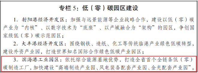 滨海港工业园区:依托综合能源基地优势,打造全省首个全链条低(零)碳制造工厂,加快建设“高端制造产业园、风电装备配套产业园、金光配套产业园”。