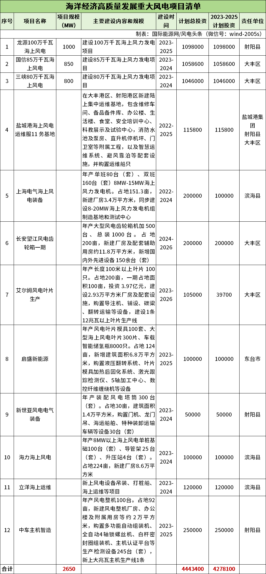 《通知》对盐城市海洋经济高质量发展重大风电项目进行公示,共计12个项目,装机累计2650MW。项目包括海上风电项目、风电装备制造。