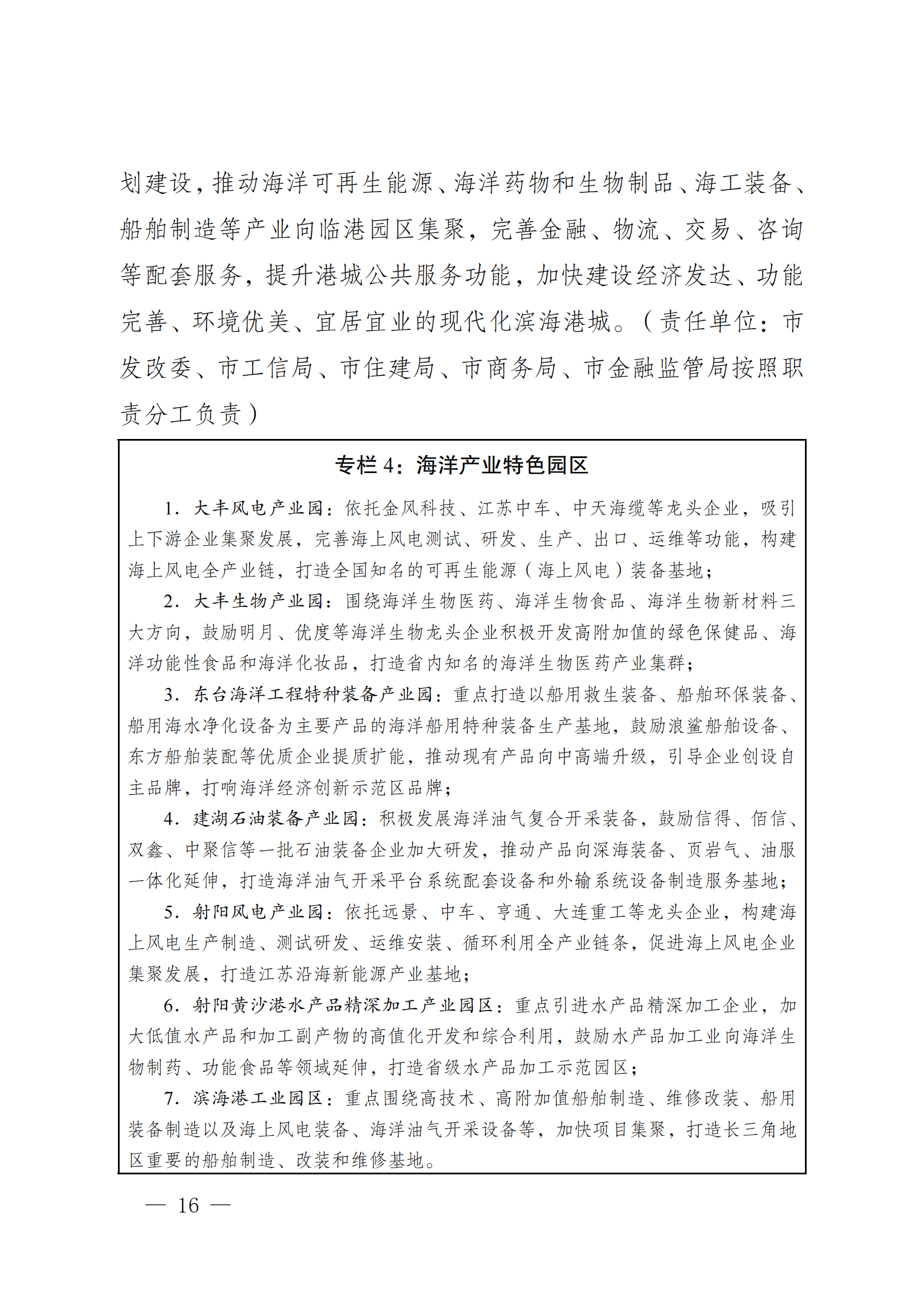 滨海港工业园区:重点围绕高技术、高附加值船舶制造、维修改装、船用装备制造以及海上风电装备、海洋油气开采设备等,加快项目集聚,打造长三角地区重要的船舶制造、改装和维修基地。