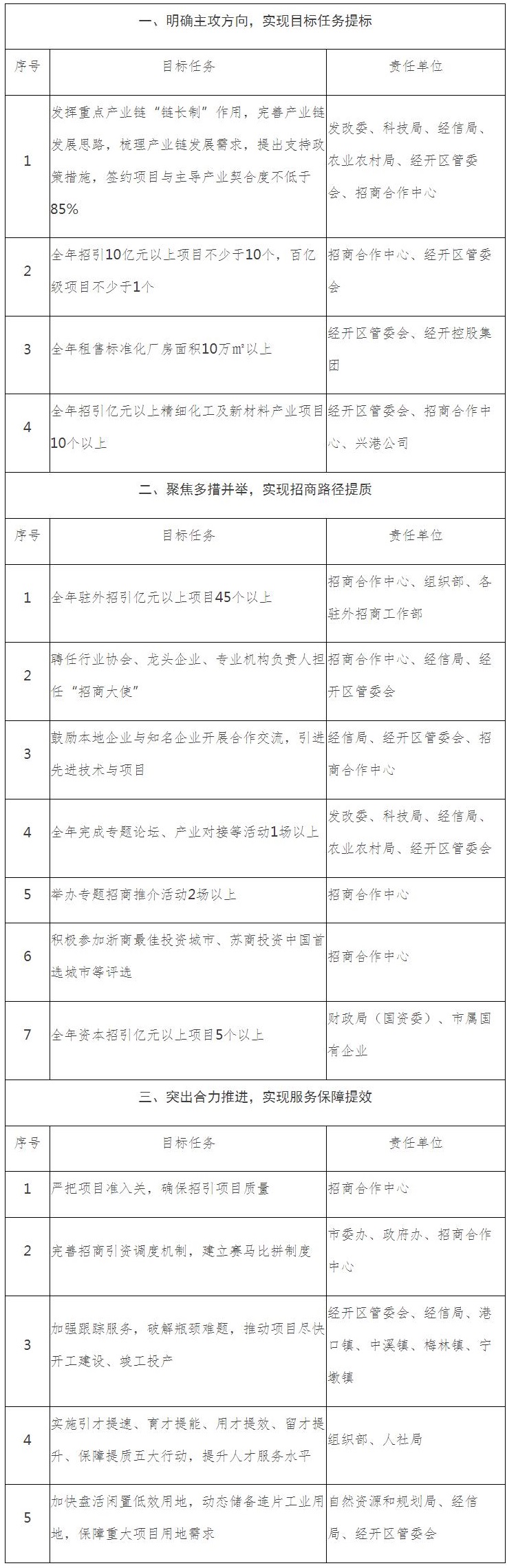 11.强化落地服务。坚持问题导向,加强跟踪服务,对已开工的项目,倒排工期,挂图作战,力争尽早达产见效;对未如期开工竣工的项目,逐个剖析原因,主动靠前服务,破解瓶颈难题,推动项目尽快开工建设、竣工投产。(牵头单位:经开区管委会、经信局、港口镇、中溪镇、梅林镇、宁墩镇,配合单位:市直各相关单位)