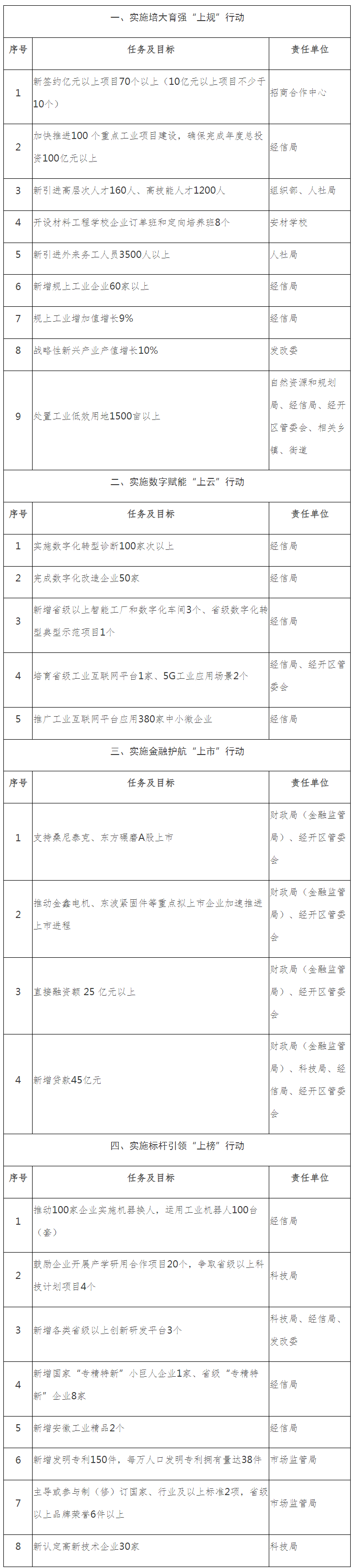 锚定“追赶江浙、争先江淮”的总目标,力争2024年新签约亿元以上项目70个以上,新增规上工业企业60家以上,新认定高新技术企业30家以上,新增上市企业1家以上;规上工业增加值增长9%以上,战略性新兴产业产值增长10%以上。