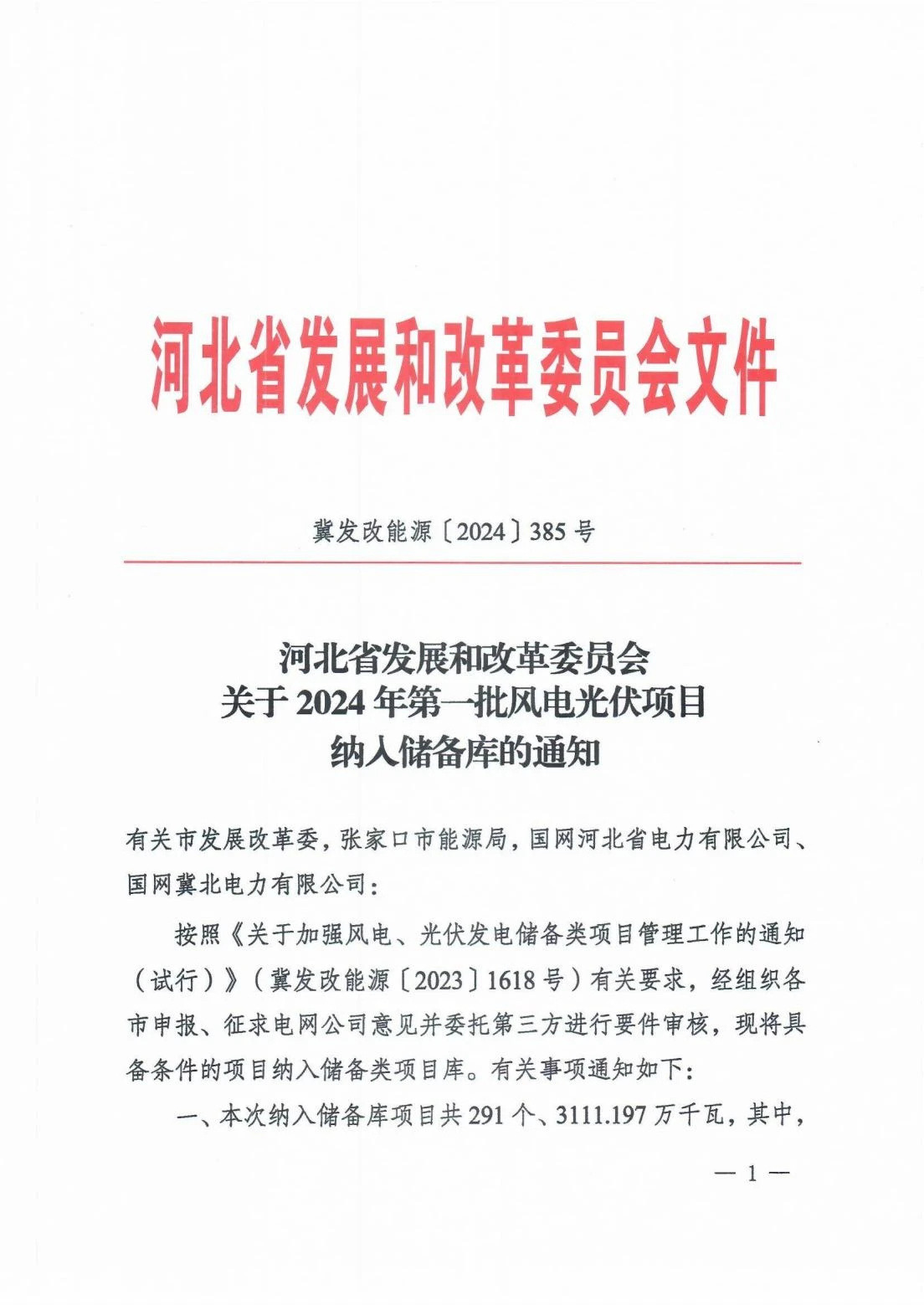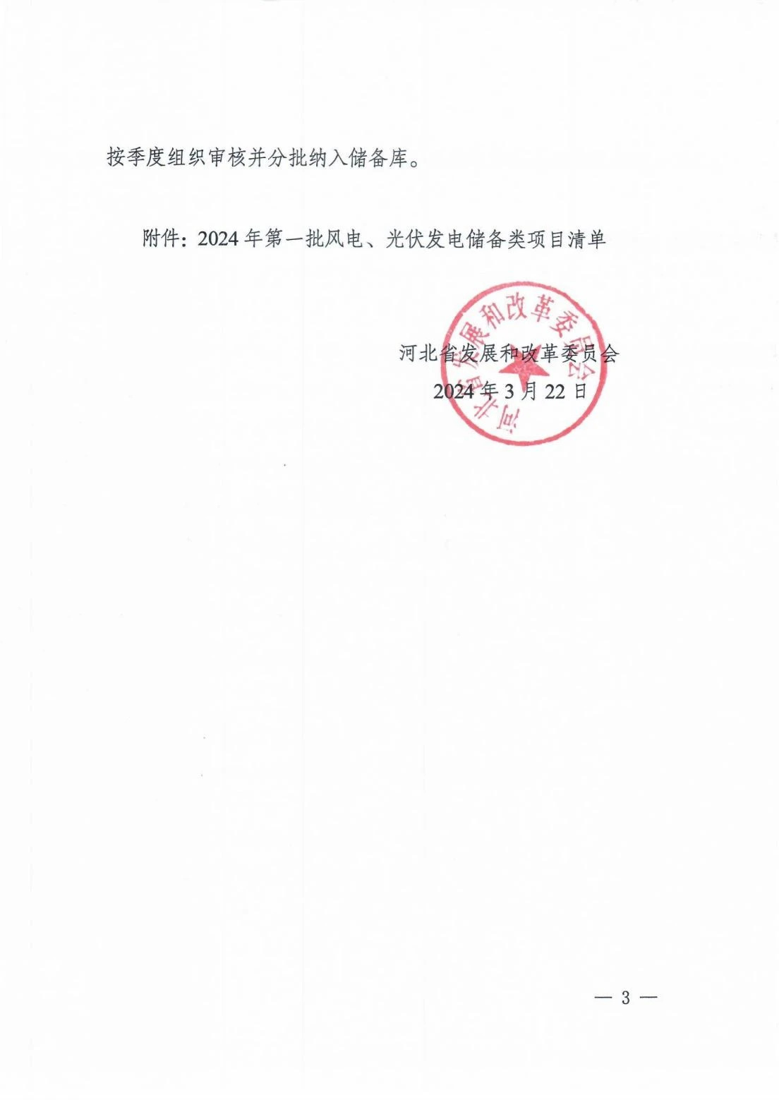 3月22日,河北省发展和改革委员会发布《关于2024年第一批风电光伏项目纳人储备库的通知》。