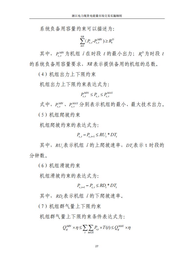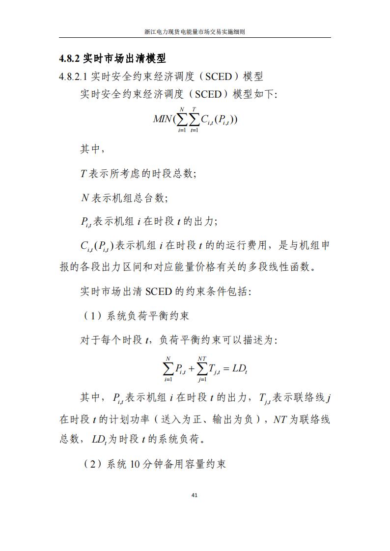 实时市场中,电力调度机构基于最新的电网运行状态、超短期负荷预测与超短期新能源出力预测信息,综合考虑发电机组运行约束条件、电网安全运行约束条件、日内机组启停、日内省间现货交易、日内华东区域辅助服务市场交易等因素,在日前市场与日前调度计划调整确定的开机组合基础上,以发电成本最小为优化目标,采用安全约束经济调度(SCED)算法进行优化计算,滚动优化机组出力,形成各市场机组需要实际执行的发电计划和实时节点电价,确保系统平衡、实施阻塞管理。