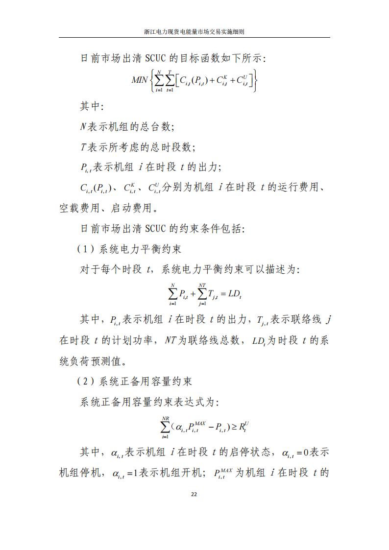 现阶段采取“发电侧报量报价、用户侧报量不报价且不纳入出清”的模式组织日前电能量市场交易。日前电能量市场采用全电量申报、集中优化出清的方式开展。浙江电力调度机构综合考虑统调负荷预测、母线负荷预测、外送受电曲线、非市场机组出力曲线、发输电设备检修计划、发电机组运行约束条件、电网安全运行约束条件等因素,以社会福利最大化为优化目标,采用安全约束机组组合(SCUC)、安全约束经济调度(SCED)算法进行集中优化计算,出清得到运行日的机组开机组合、分时发电出力曲线以及分时节点电价,售电公司和批发用户分时中标价格,并以此为基础编制日前预调度计划。